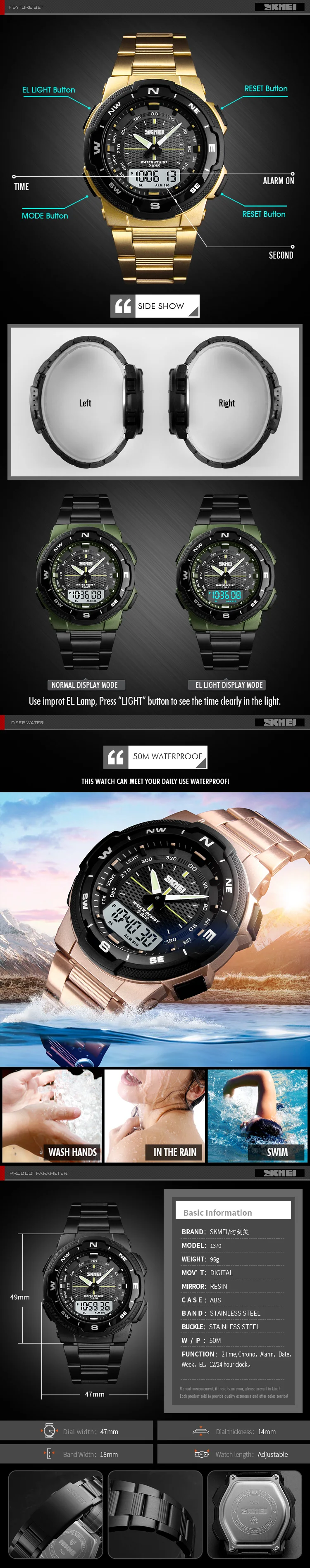 Functions: 5bar Water Resistant/Date / Stopwatch / Double Time / Week / EL Light / Alarm / 12/24 Hour